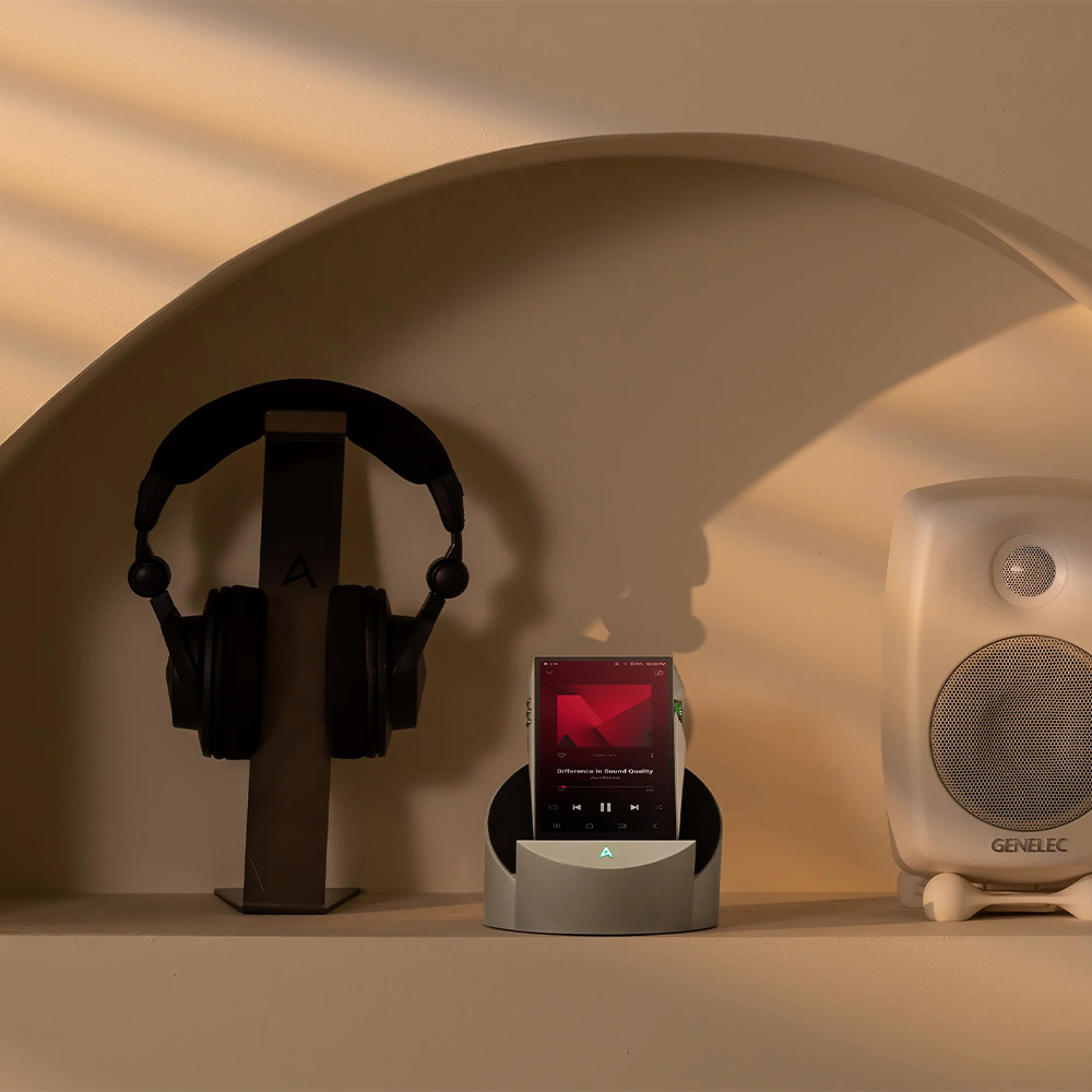 More than a simple charging stand, the AK Cradle combines audiophile-grade connectivity, studio-quality balanced XLR outputs, and a striking aluminium design inspired by the geometry of the circle. Its 50-degree ergonomic tilt and sliding port system ensure a perfect fit and easy operation, while the illuminated Astell&Kern “A” logo displays playback bit-rate in real time.