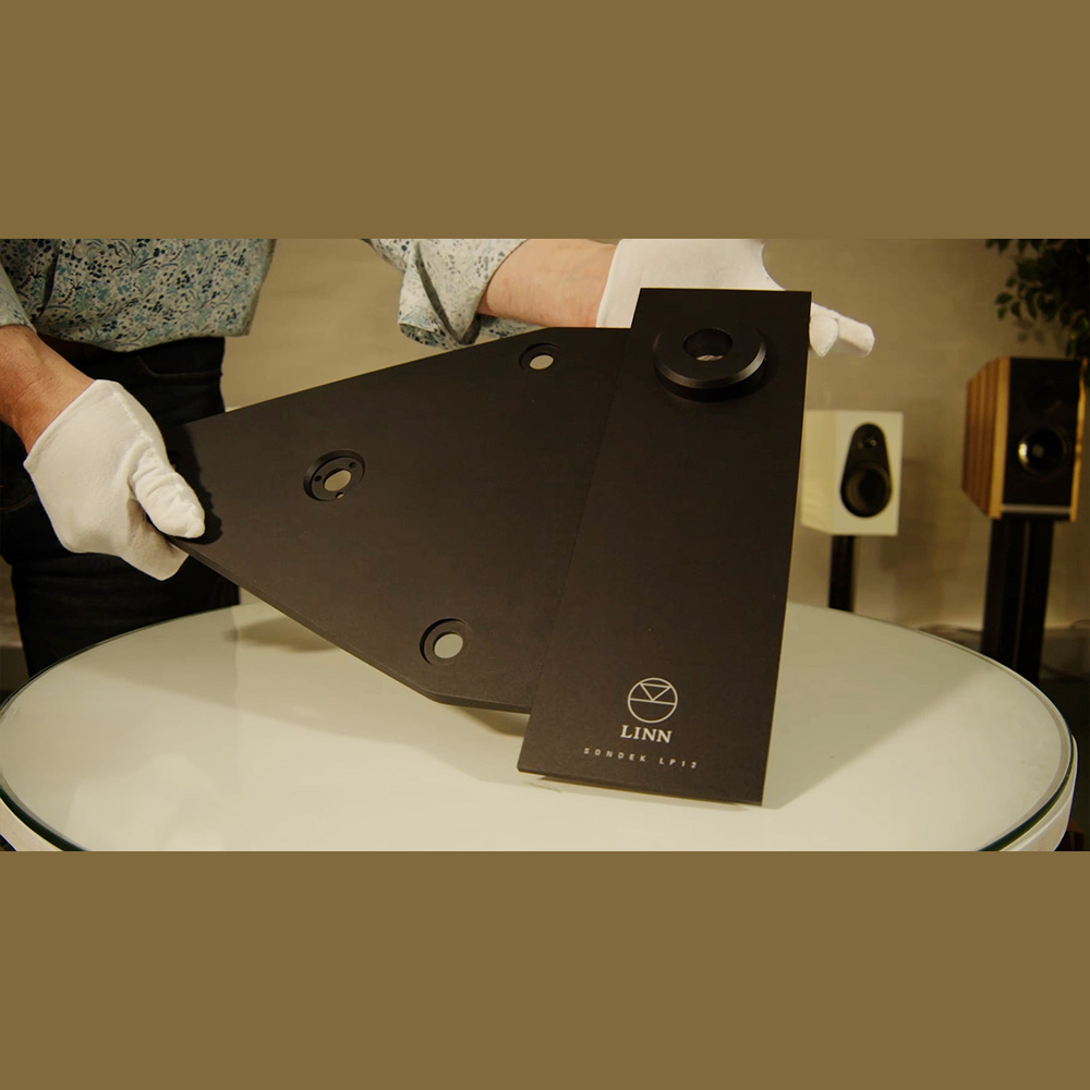 The Linn Keel SE in Jon's gloved hands being held at an angle.  There's a Linn 119 speaker in white visible in the background