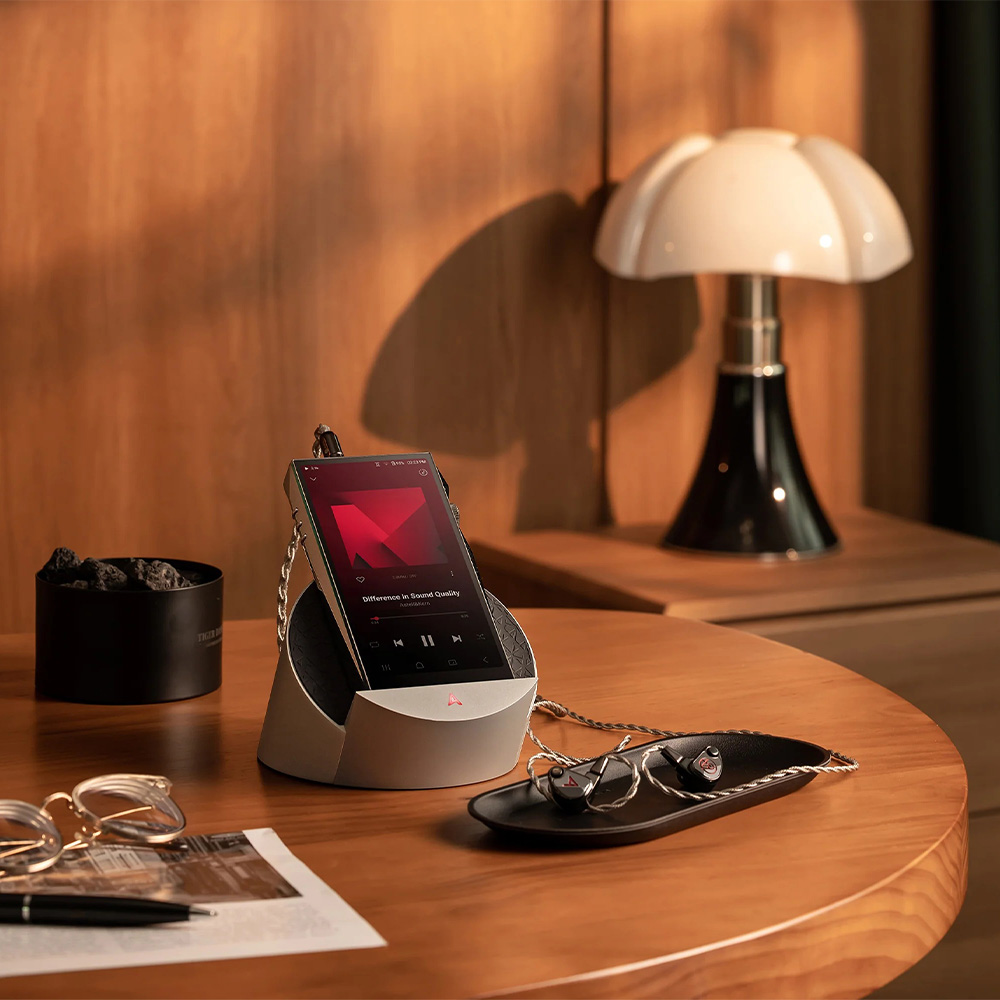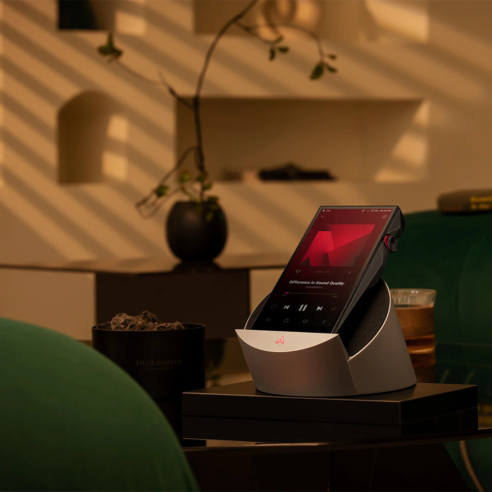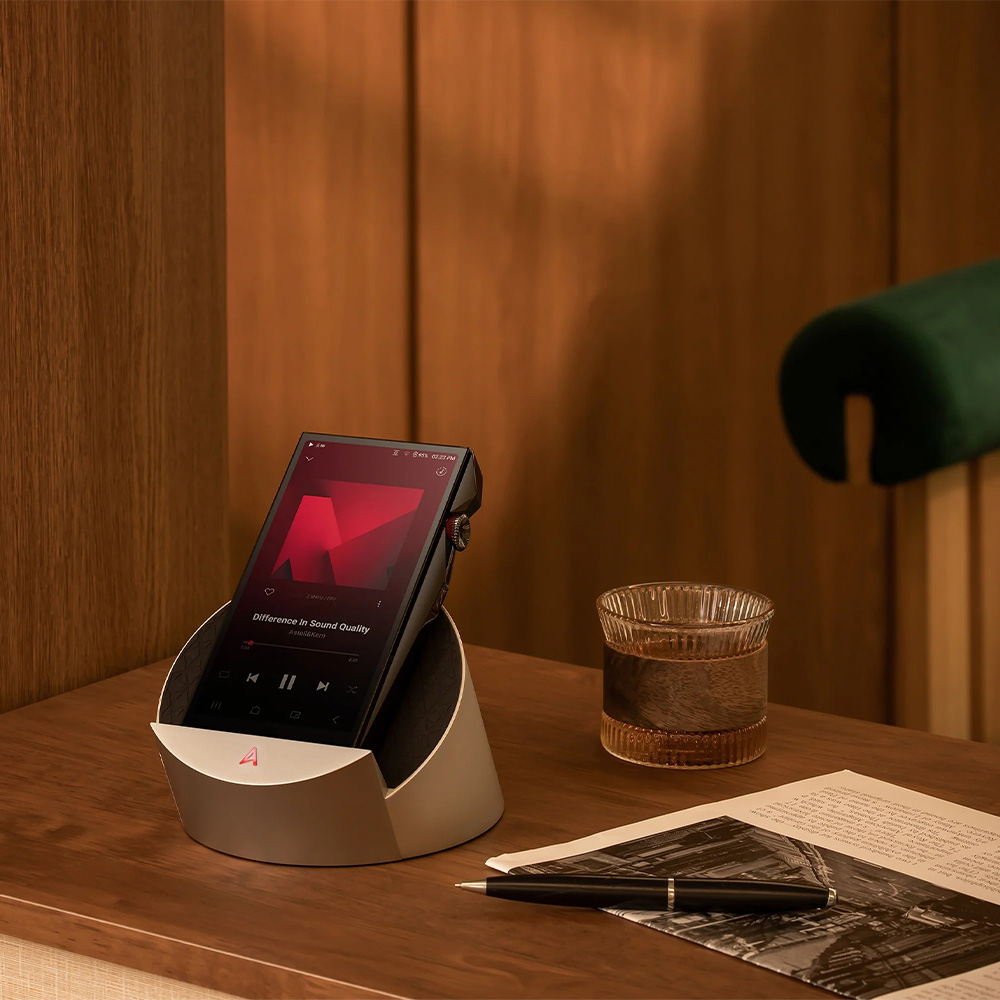 More than a simple charging stand, the AK Cradle combines audiophile-grade connectivity, studio-quality balanced XLR outputs, and a striking aluminium design inspired by the geometry of the circle. Its 50-degree ergonomic tilt and sliding port system ensure a perfect fit and easy operation, while the illuminated Astell&Kern “A” logo displays playback bit-rate in real time.