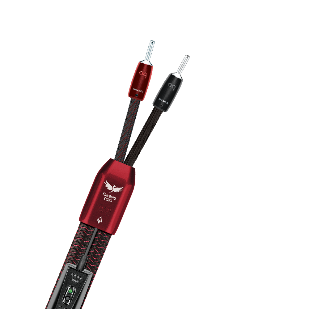 When possible, running separate cables to the treble and bass “halves” of a speaker significantly reduces distortion. Bi-Wiring keeps the large magnetic fields associated with bass energy out of the treble cable, allowing the delicate upper frequencies to travel a less magnetically disturbed path, like taking the waves out of the water when you swim. AudioQuest’s RF/ND-Tech (patented RF-Canceling Ground-Noise Dissipation) attracts RF energy away from the amplifier’s output. When properly implemented, Bi-Wiring has always been a cost-effective way to get better performance for the same or less money. With RF/ND-Tech, the advantage of Bi-Wiring is much more dramatic. Because RF/ND-Tech is so effective, BASS model cables are only for 10KHz and below; do not use a BASS cable full-range or on treble. FireBird BASS cable is ideal with FireBird ZERO. A Bi-Wire COMBO with BASS and ZERO cables joined together at the amplifier is usually most convenient. When Tri-Wiring, use BASS cables on the Midrange and Bass inputs. Caution: Do not Bi-Wire with two ZERO cables. ZERO cables in-parallel can create a very high-frequency resonant peak (ringing), and resulting poor sound. Only use a ZERO plus a BASS cable (whether or not joined as a COMBO). Second best is a single ZERO with AQ Bi-Wire jumpers.