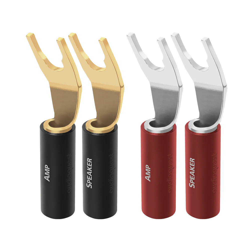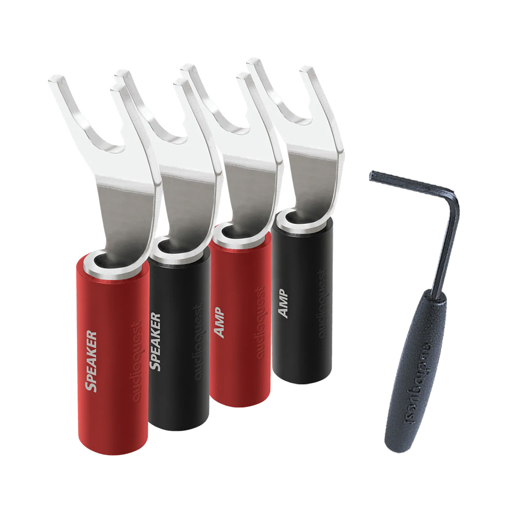 Use AudioQuest SureGrip 100 Multi-Spades to create a secure, high-performance connection between your speaker cable and loudspeakers. AudioQuest uses High-Purity Purple Copper base metal, which is stronger, more conductive, and sounds better than the typical phosphor-bronze used in most connectors. Direct-Gold/Silver Plating looks great while avoiding sonically degrading intermediary layers of lesser-quality metal. The included mini-wrench creates a simple, secure cold-weld connection without requiring sound-damaging solder. Bare speaker wire is messy and unreliable. Compatible with universal speaker binding posts and cables up to 9AWG, AudioQuest SureGrip 100s create a clean, finished look while ensuring excellent sonic performance.