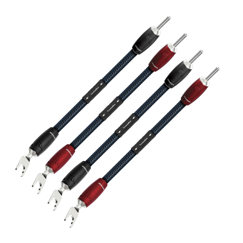 ThunderBird BiWire Jumpers employ Direction-Controlled Solid Perfect-Surface Copper+ (PSC+) covered with a Conductive Carbon-loaded extrusion that reduces RF pick-up. Available with AudioQuest’s 500-Series Hanging-Silver plated Purple Copper spades or bananas on either end — simplifying the connection where the speaker cable is attached.