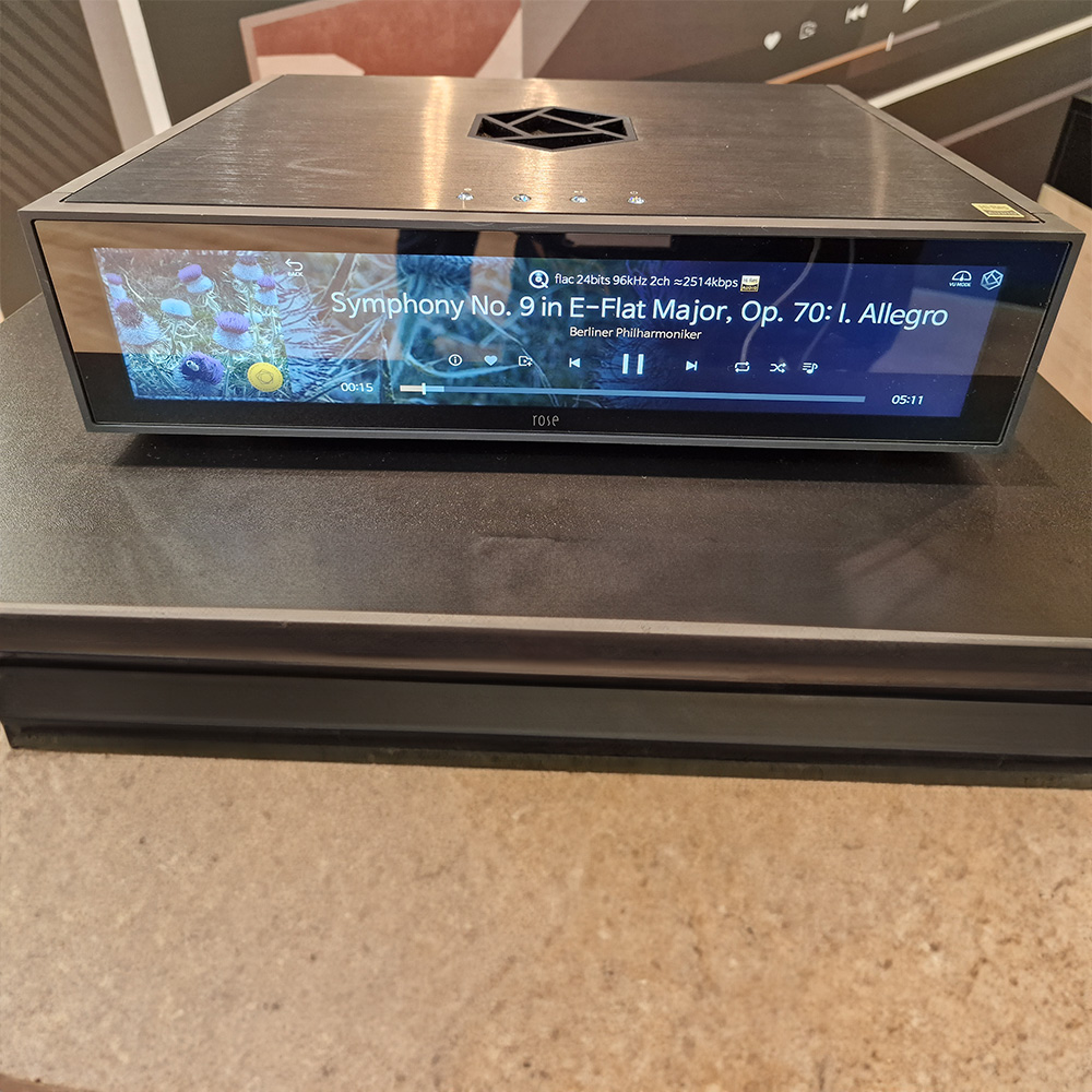 Includes IR/Bluetooth remote and uses a customised Android 7.1 based Rose operating system that works with the ROSE Connect app (Android, iOS, PC). While the front panel supports a large 15.4″ TFT LCD & Capacitive Touch Screen (eDP) providing convenient local control and display of album/file data, album art work, video and setup parameters.