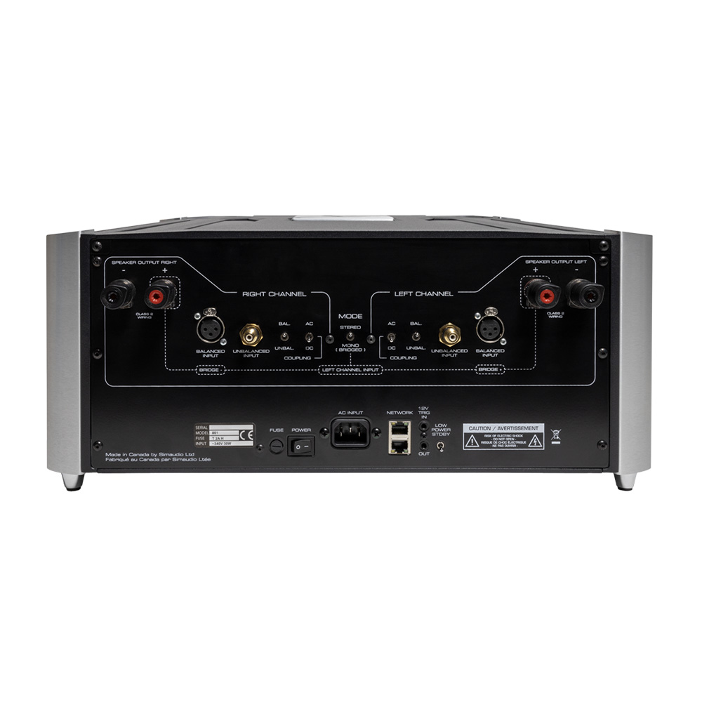 The ingenious new MDCA (MOON Distortion-Cancelling Amplifier) circuit resolves audio with the purest detail and pace. Its power supply boasts two 1,500 VA low-noise MOON transformers and 228,000 uF capacitance with unwaveringly stable thermal equilibrium. At the flip of a switch, the dual mono design outputs 300 watts per channel into 8-ohm stereo loads, doubling into 4 ohms, or 800 watts into 8 ohms as a bridged monoblock.