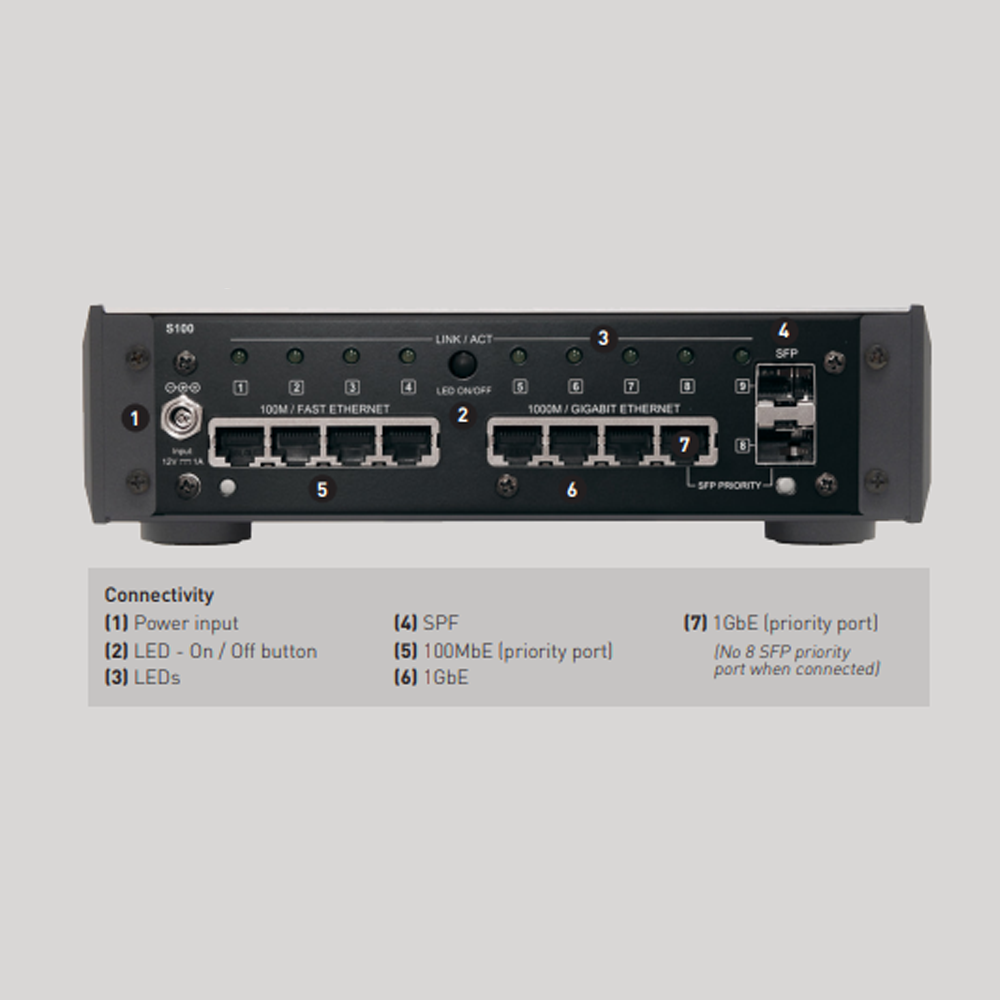 The Melco S100/2 is quite an unusual architecture compared to an IT dataswitch. There are four 100Mb RJ45 ports – these provide the best audio quality. There are four 1Gb ports – these are ideal for PC connectivity, and are ideal for the Roon Core processor which generates high traffic flow. Two additional SFP ports allow for connection of optical fibre for components such as Lumin that support it. Key to creating a stable and resilient data stream for extreme Hi-Res streaming is the Packet Buffer and S100 has 1.5MB of buffer capability to deal with erratic external connectivity. Audiophile techniques are used in the power supply implementation with a bank of audio-grade capacitors to ensure the lowest noise environment. Mechanical stability contributes to system performance and the S100 is built on a rigid steel chassis with total screening provided by the totally metal enclosure which matches Melco Audiophile NAS components. Power supplies are external to the S100 giving good isolation and allowing for future upgrade to external linear power supplies.