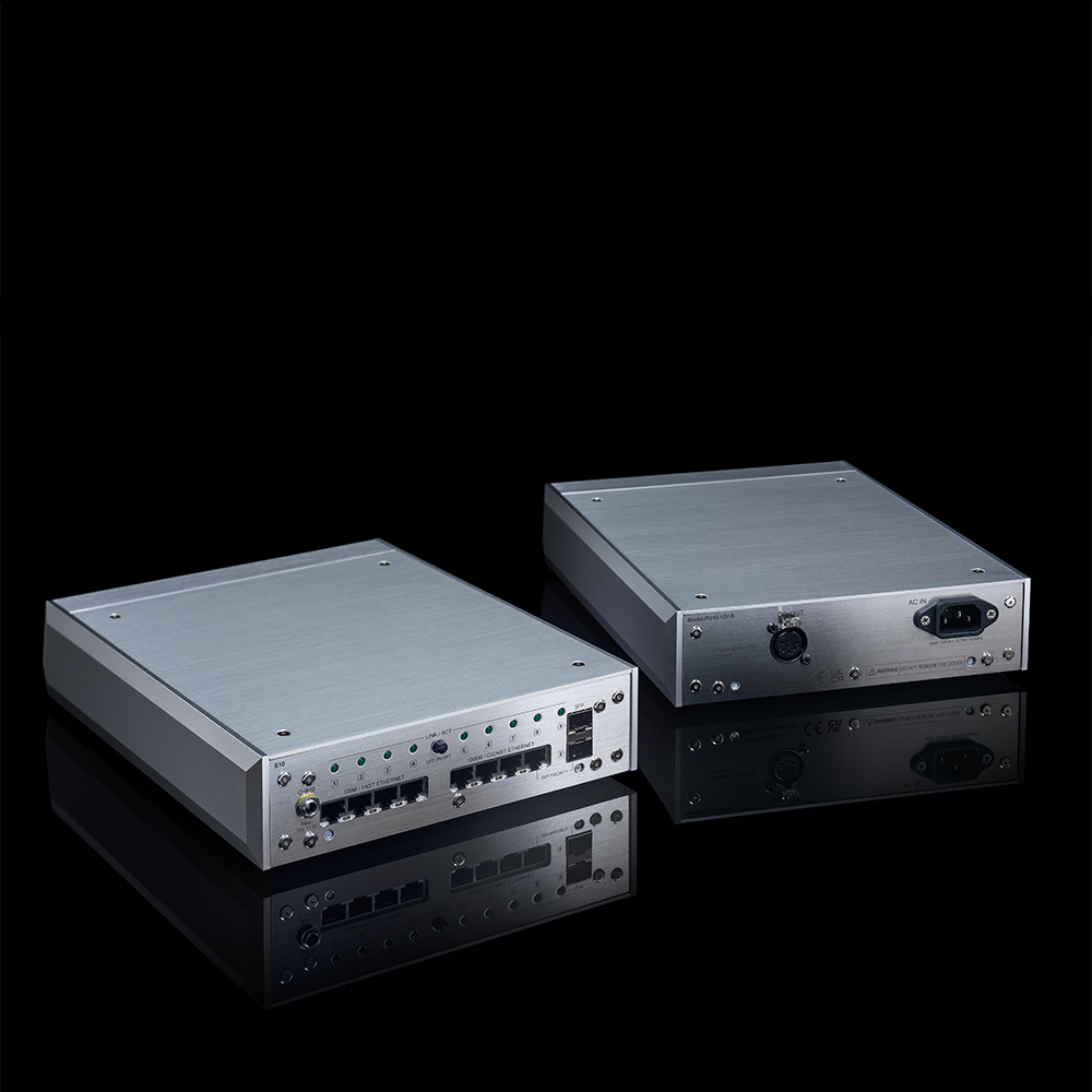 The rear panel connections include different speed RJ45 Ethernet ports: 4x 100 MB and 4x 1 GB, the latter of which are useful for the Roon Core processor which generates high traffic flow. In addition, 2x 1 GB SFP (Small Form Factor) ports are also included for direct fibre connections and compatibility with supported devices.