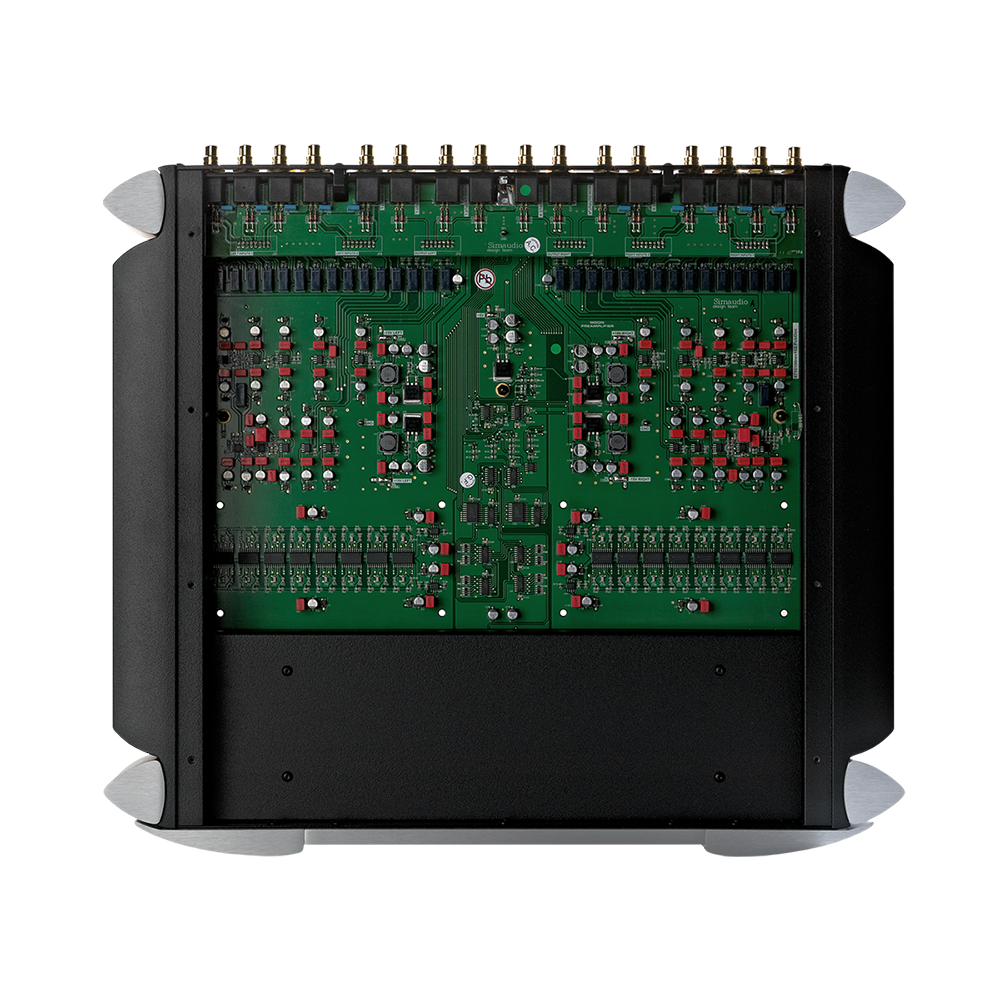 • 2-chassis design with 1 chassis housing the power supply, digital controller circuitry, software processing & the LED display. The other chassis contains ONLY audio circuitry.