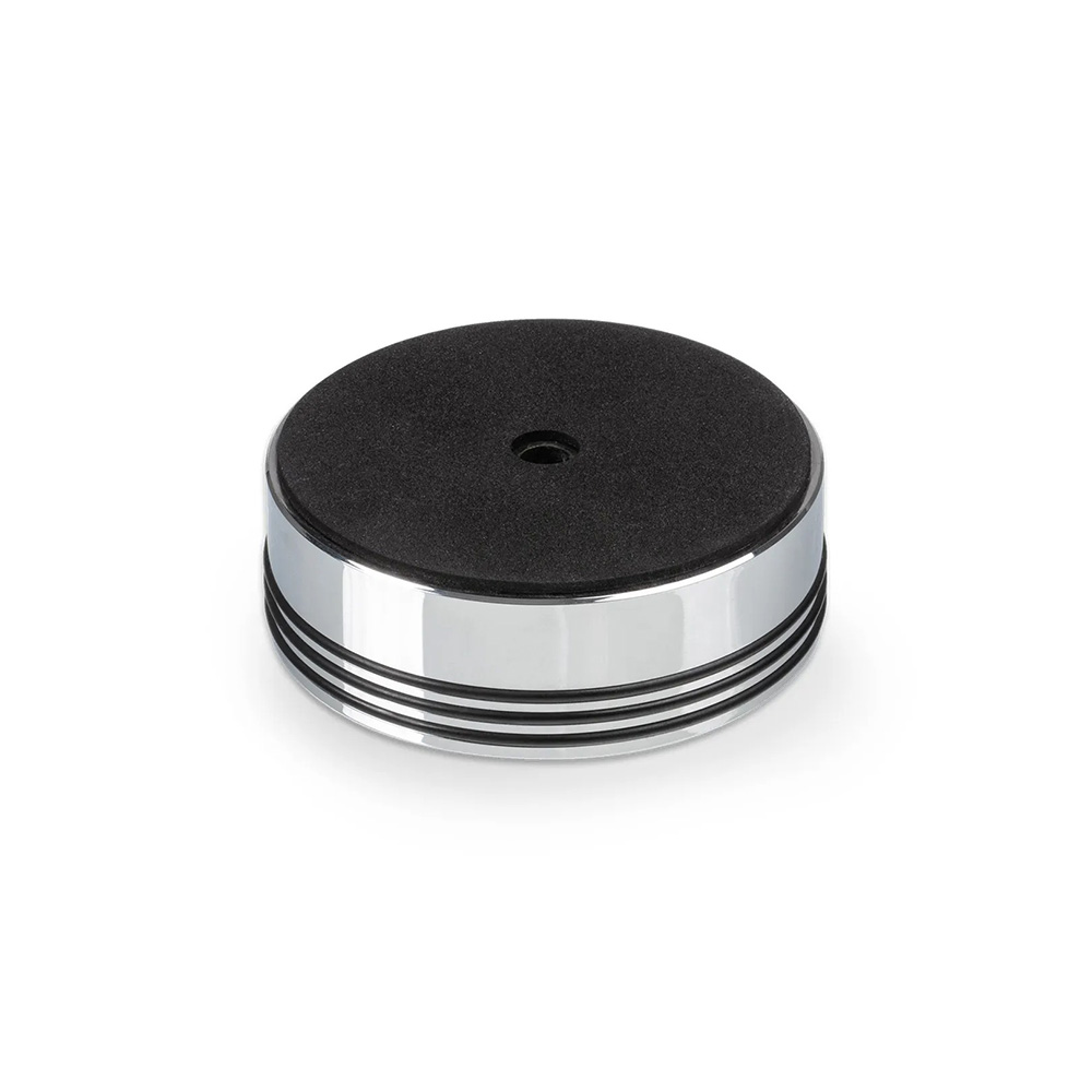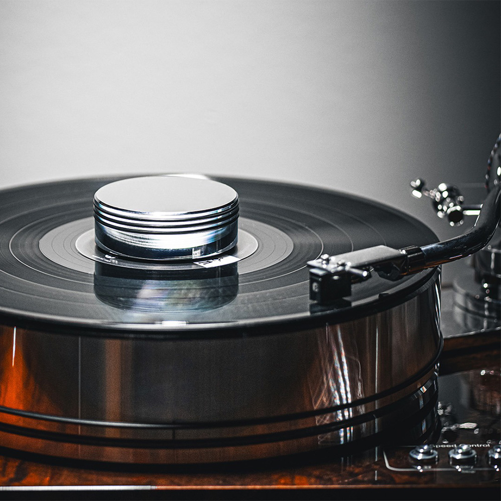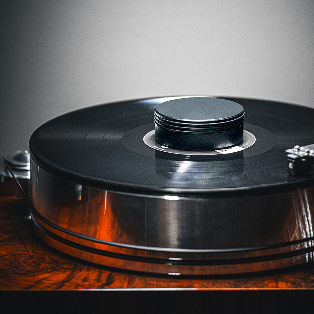 This new record puck ensures a secure fit between record and turntable. With the two different finishes, black painted and polished aluminium, it perfectly fits the design of Project turntables. Record pucks use weight to secure a playing vinyl record against the turntable platter. By holding the two together, the sound performance of the turntable will improve, in timing and depth of sound. With a weight of 1030 grams, this puck is not recommended for smaller turntables as it could burden the turntable bearing.