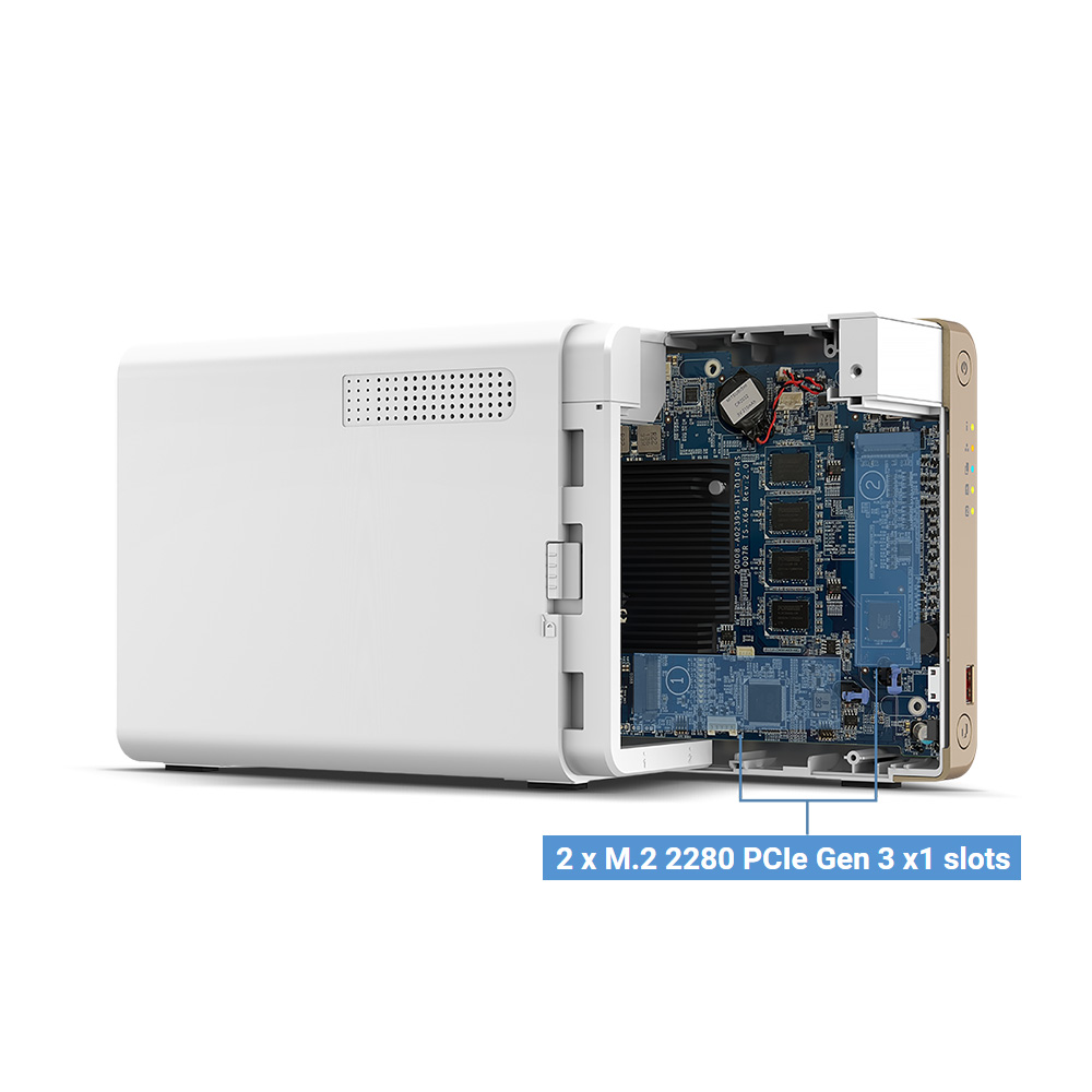 The TS-262 has two M.2 PCIe Gen3 slots, enabling SSD caching or SSD storage pools for improved performance, or Edge TPU for AI image recognition.