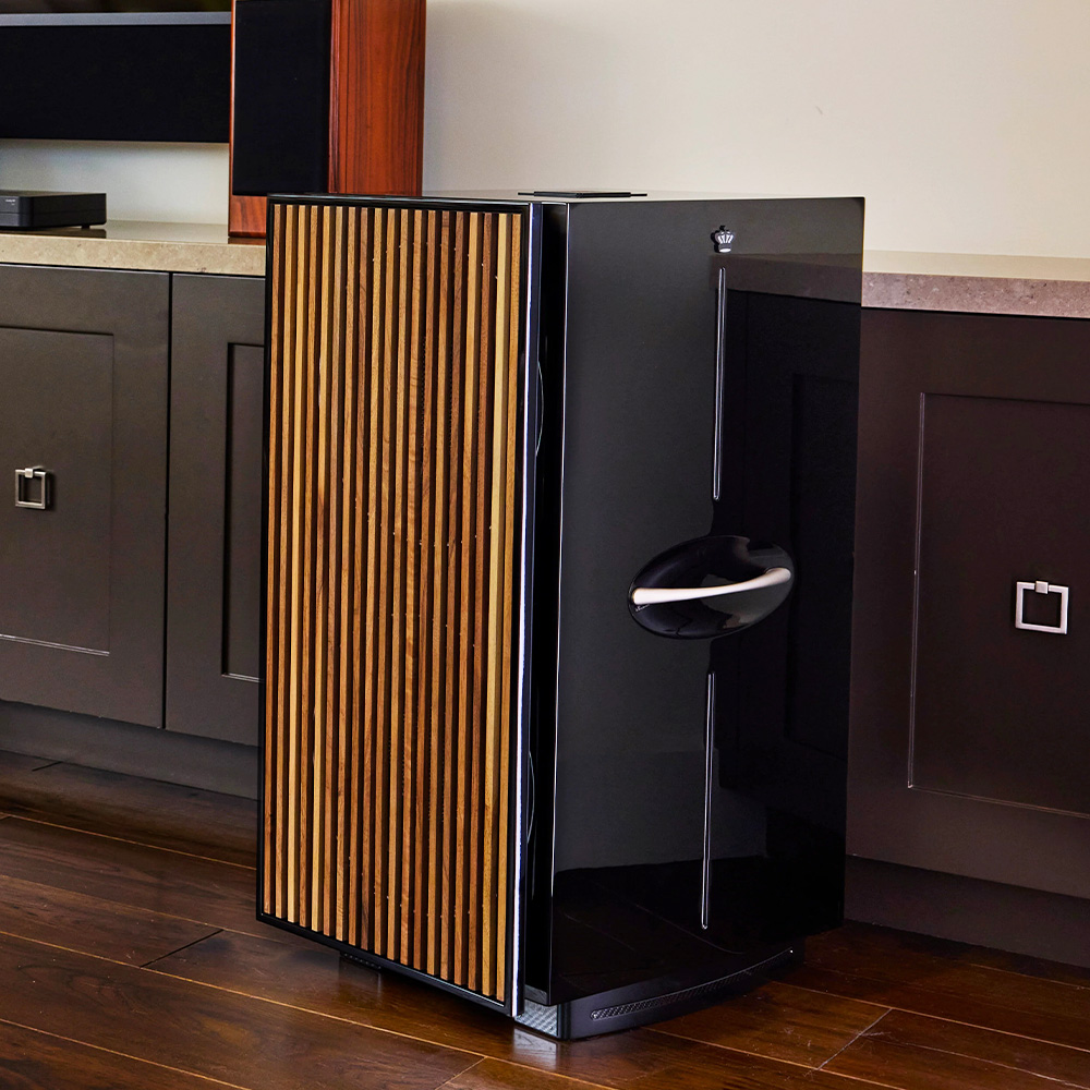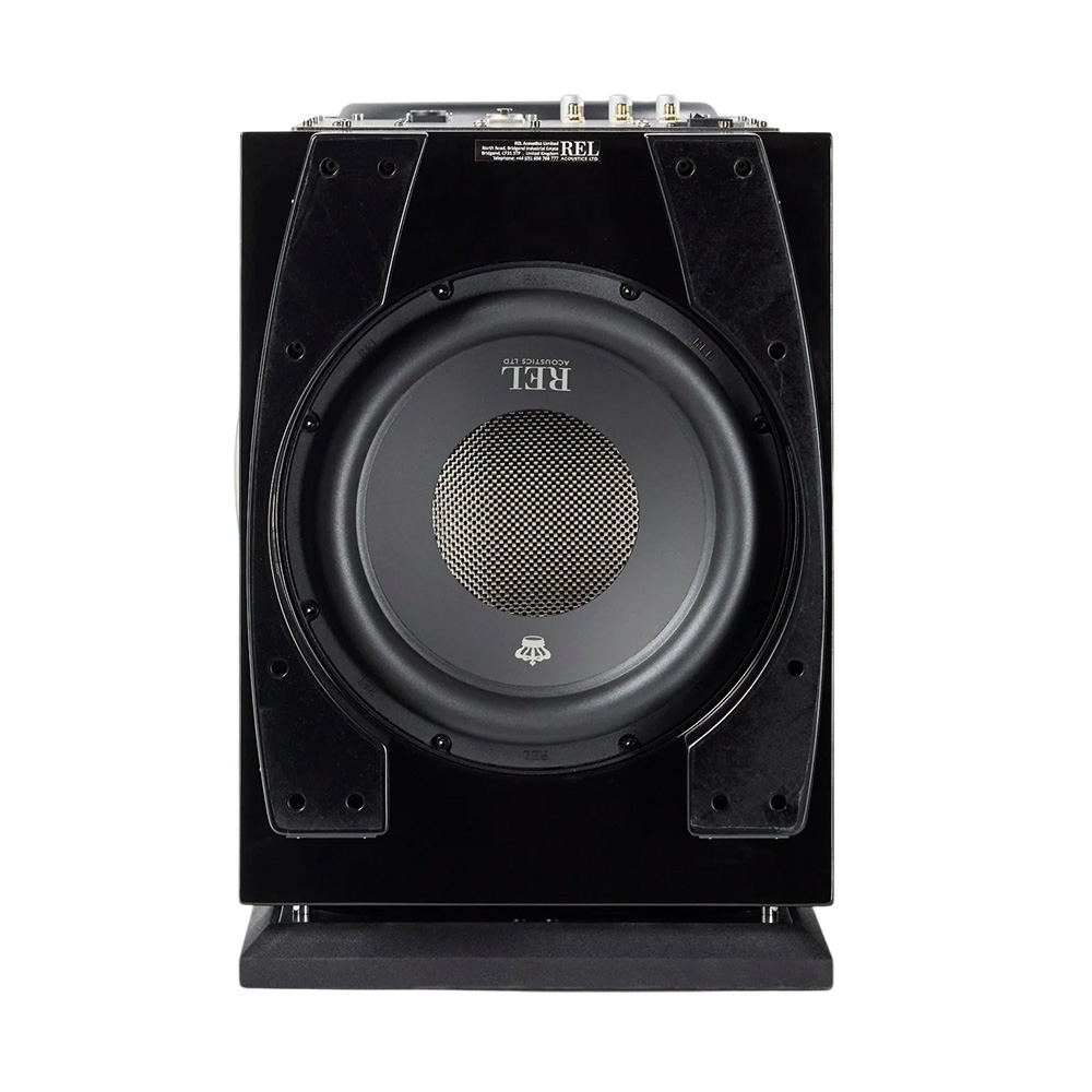 In a REL product line defined by gorgeous cabinetry, perhaps no model has received a more comprehensive update than 212 Black Label. A single vertical strake runs the cabinet’s height, capped by a distinctive crown badge that signals its refined status. On the top panel, an all-black badge framed in carbon fibre further marks it as Black Label. The warm silver, bead-blasted handles have a raw titanium feel, both striking and practical, while solid billet aluminum inside keeps things safe and steady, cutting down on unwanted resonance. An optional premium wood grille enhances both airflow and aesthetics, completing a design of unmistakable authority and refinement.