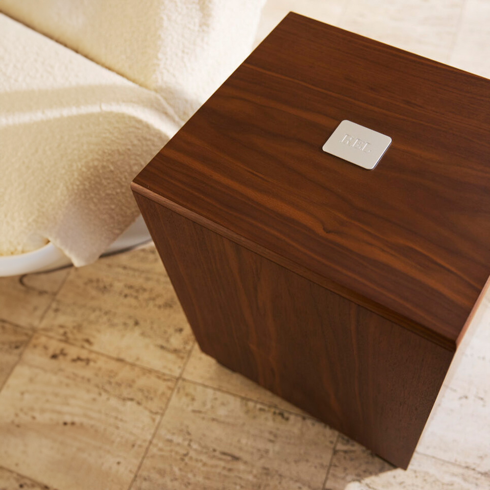 Classic 99 adopts the form language introduced in its model 98 stablemate. As comfortable as a pair of well-worn loafers, it features solid cabinet walls as thick as 32 mm, clad in rich, warm walnut veneer, hand fitted with care. The simplest of natural aluminium badges and softly radiused feet milled from solid billet, blacked out to allow it to seemingly float, ensure that nothing, not even a grille disturbs the vibe. Yet, as with all RELs, the styling conveys far more than simple comfort. The down-firing 12” driver, while unseen, will surely be felt. Continuing to the rear panel, one finds the period-correct detailing extends to the amplifier panel, where all controls are finished in lovely white gold. Everything that one encounters has the heft of quality switch gear, even the click made by the phase switch is near perfection. Quality abounds everywhere one looks or touches.
