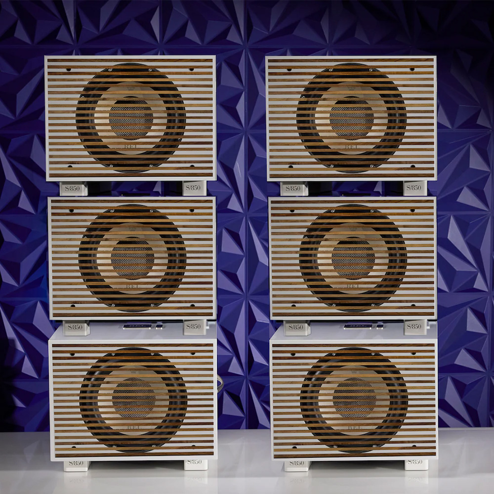 The S/850 cabinet is longer, lower, wider, and deeper—proportions that give it a naturally dynamic presence. Subtle design details refine its look and feel: clean creases that catch the light, warm silver-gold badges with a titanium-like finish, and stainless-steel handles recessed into graceful ellipses. Beneath each front rail, precision-milled billet cylinders provide exact leveling, while thick internal aluminum slabs secure the handles for safe stacking in Line Arrays. Designed to complement modern interiors, the S/850 also offers an optional Premium Wood Grille, adding warmth and individuality.