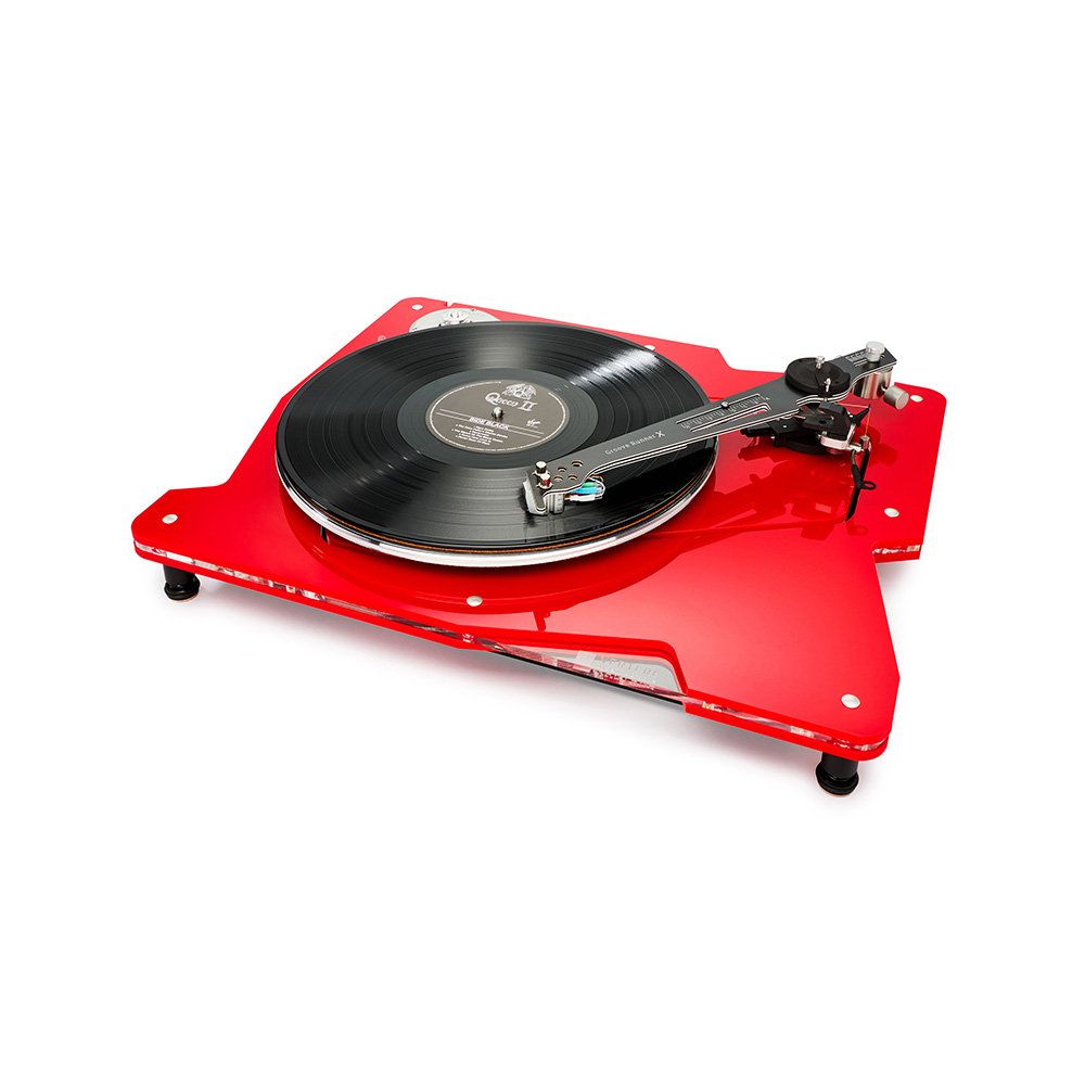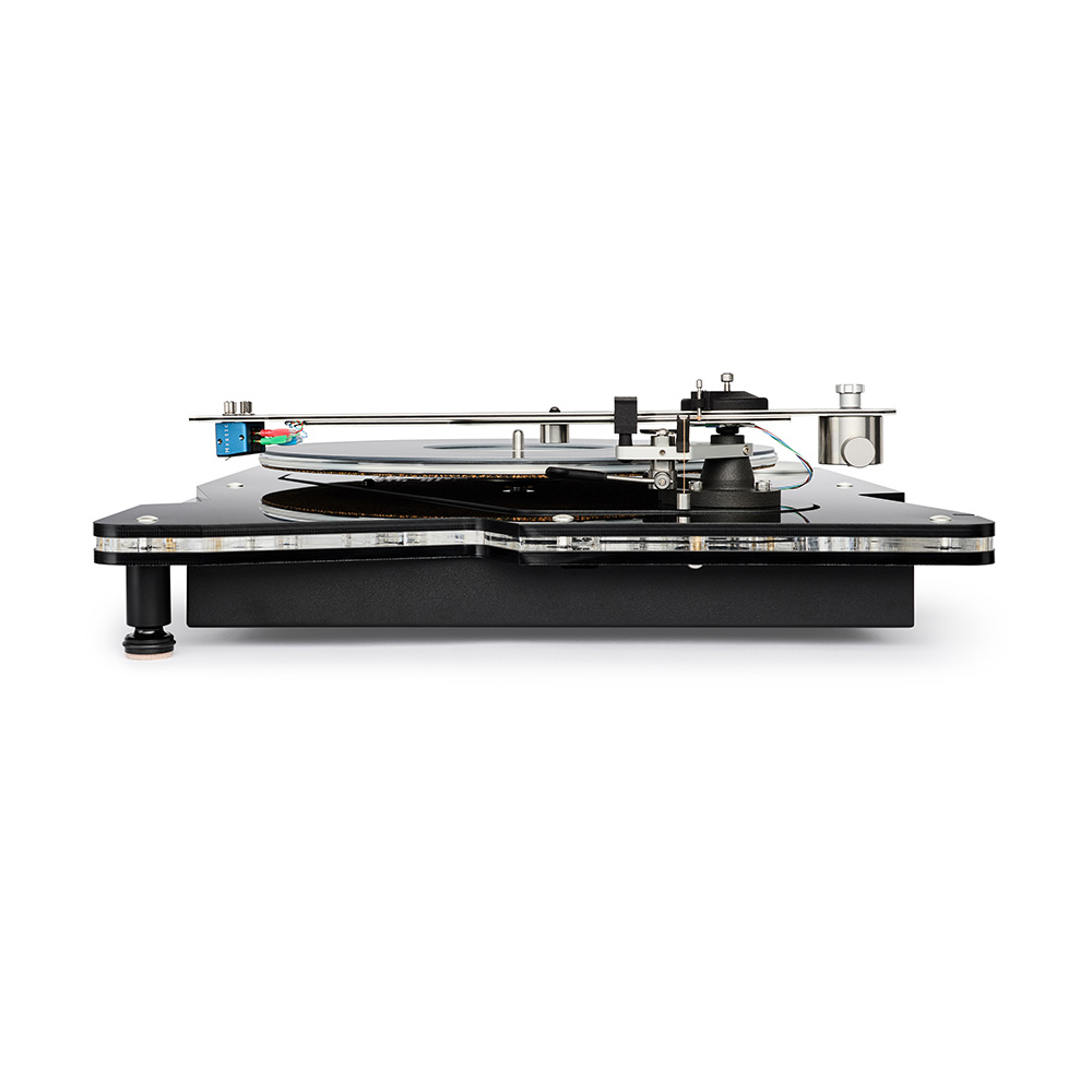 Like the pulley, the platter itself is also precision-machined alloy, to the top of which is bonded a PETG record interface mat. On the underside an aluminium alloy bonded disc controls platter resonance while a cork/Neoprene/nitrile bonded disc protects the acrylic plinth from accidental damage that could be caused by the platter inadvertently touching the plinth.