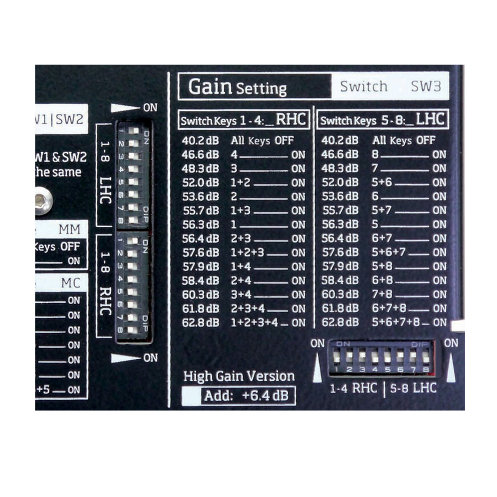 Another switch bank, also easily accessible from the underside of the unit, offers no less than 10 gain settings to provide the best level matching, within the gain range provided.