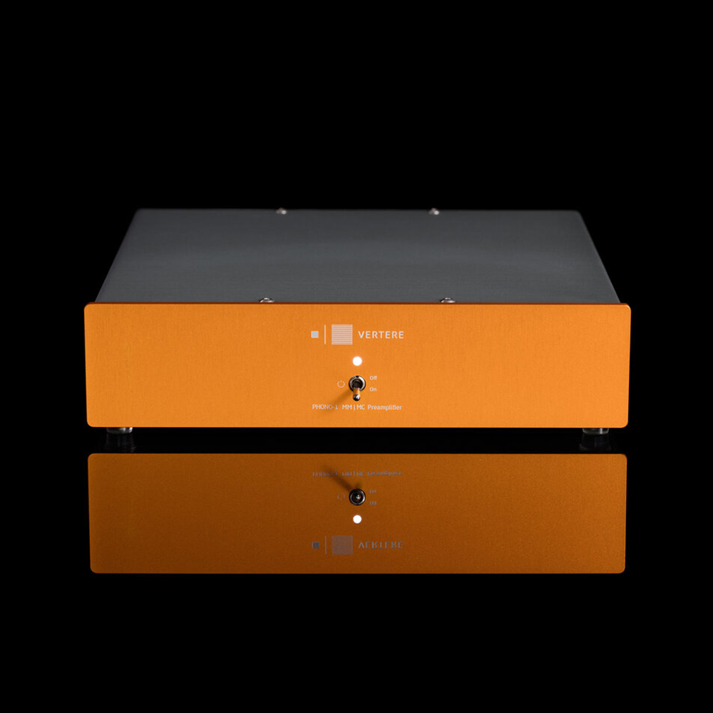 The PHONO-1 is available in a range of high-end finishes, including a new DG-1 design featuring a front panel to match the new Vertere record player (pictured). Finishes also available: Silver aluminium, Signature Vertere Orange and Semi-matt Black.